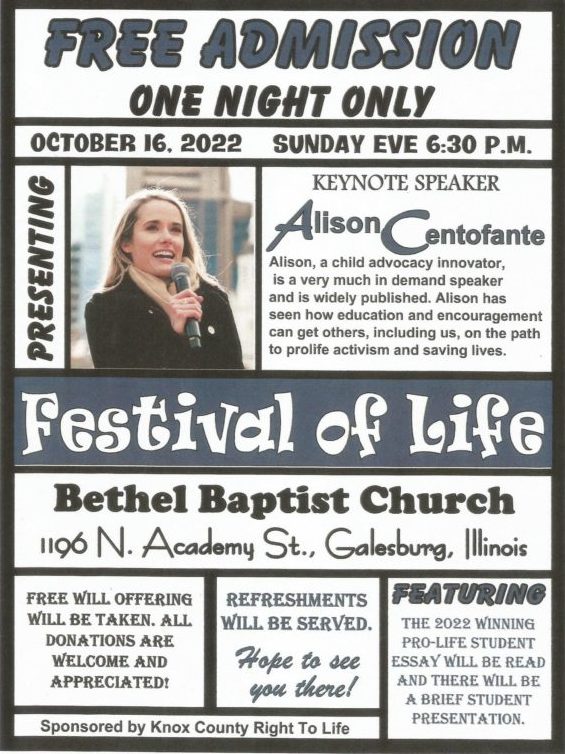 The Knox County Right to Life is hosting their annual “Festival of Life” event at Bethel Baptist Church this Sunday evening. The guest speaker will be Alison Centofante. Jennifer and Dominic Remmes from KC Right to Life joined Tom Meredith and Tyler Gumm on “Galesburg’s Morning News” to talk about the event and organization.