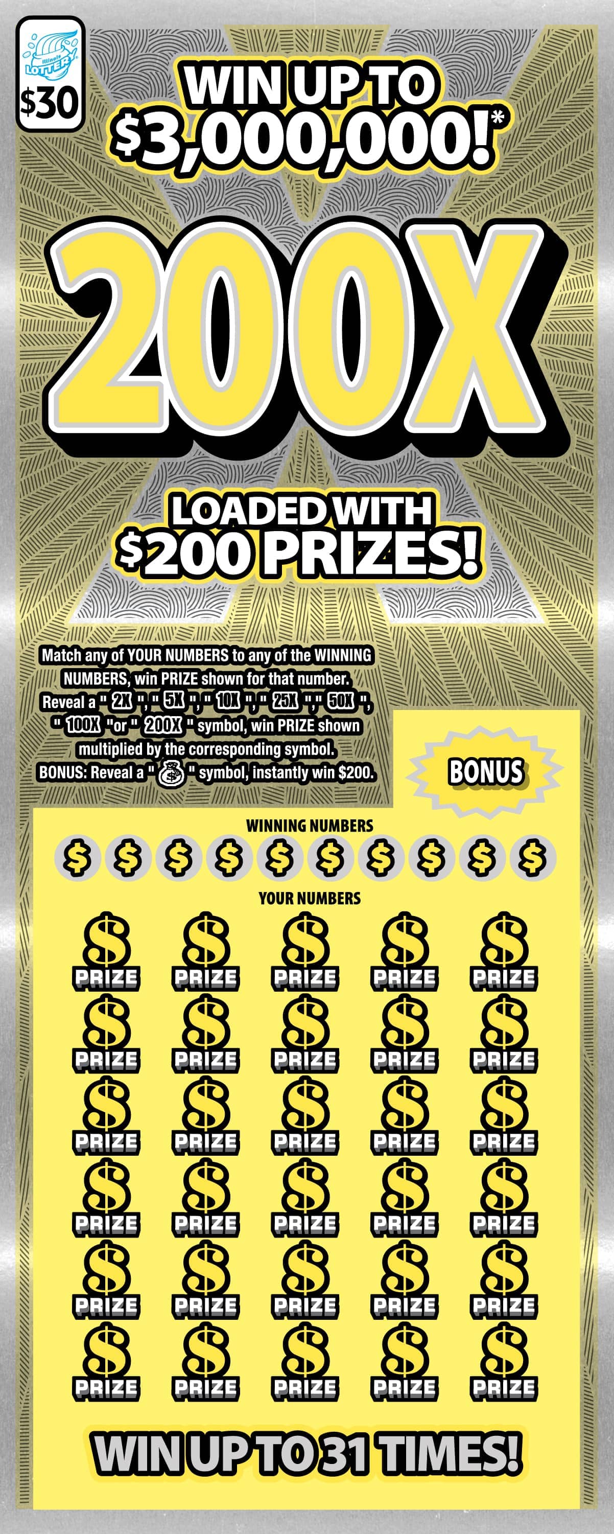 According to the Illinois Lottery website, the “200X” game offers prizes ranging from $30 to $3 million for the $30 ticket. The odds to win one of three $3 million prizes was 1 in 1,120,000.