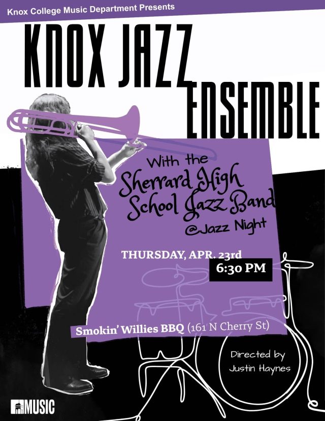 Smokin' Willies BBQ 161 N Cherry St, GalesburgThe Knox Jazz Ensemble under the direction of Justin Haynes presents a concert as part of the weekly jazz night at Smokin’ Willies BBQ with the Sherrard High School Jazz Band. Followed by the Cherry St Combo