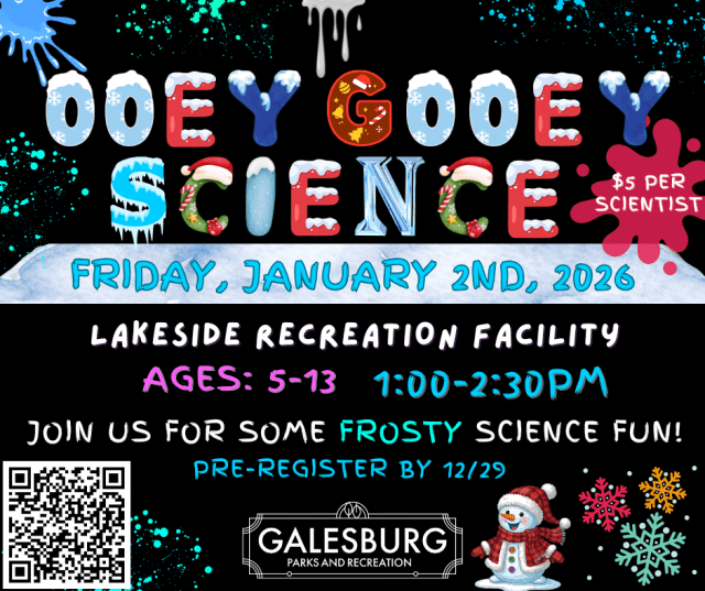 Lakeside Recreation Facility 1033 S. Lake Storey Rd, GalesburgDate: Friday, January 2, 2026 Time: 1-2:30PM Cost: $5 per scientist by December 29 Ages: 5-13 years Location: Lakeside Recreation Facility School Day off? Don't sit around the house! Come to Lakeside Recreation Facility and have some