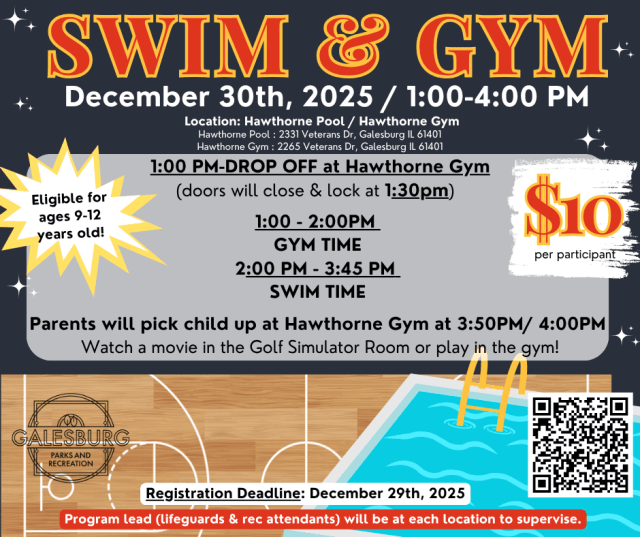 Hawthorne Gym 2265 Veterans Dr., GalesburgDate: Tuesday, December 30, 2025. Time: 1-4PM Cost: $10 per participant Ages: 9-12 years old Location: Hawthorne Gym and Hawthorne Pool Spend a day this winter break at Hawthorne Pool & Hawthorne Gym for a Swim &
