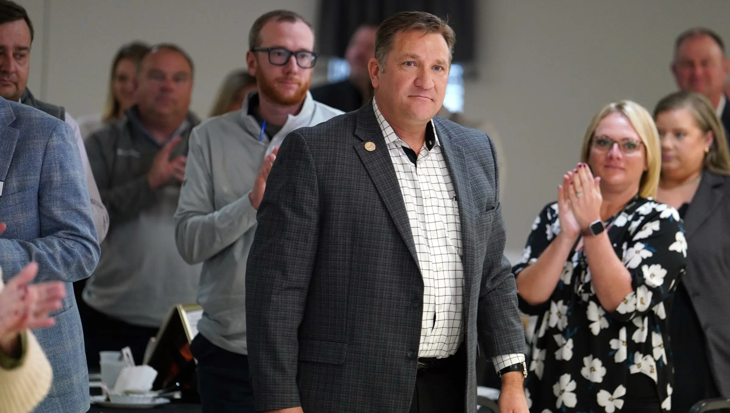 Mark Thomas, wearing a gray plaid suit jacket and white checkered shirt, stands with a humble expression as family, friends, and community members applaud behind him following the surprise announcement of his 2025 Thomas B. Herring Community Service Award at the Galesburg Area Chamber of Commerce Thanksgiving Luncheon.