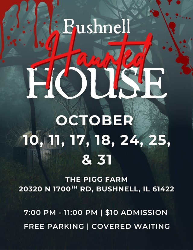 The Pigg Farm 20320 N. 1700th Rd., BushnellCheck out this haunted house run by area youth with one goal: to make you run screaming...and come back for more. Proceeds go towards the Bushnell Scouts Troop 343.