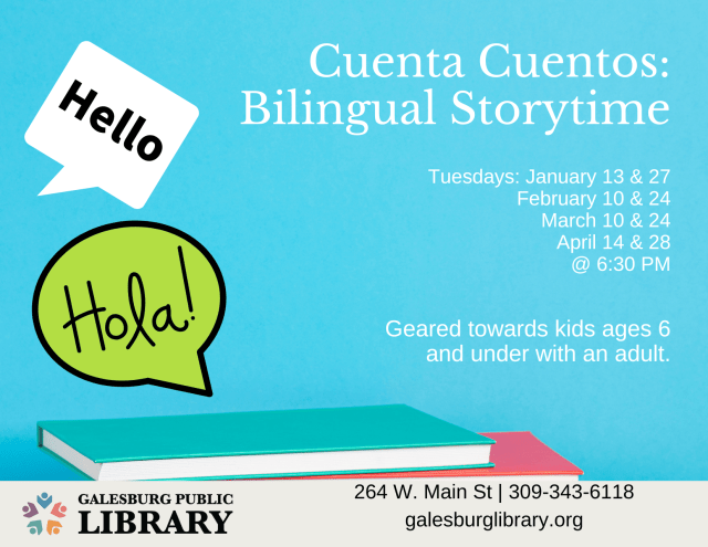 Galesburg Public Library 264 W Main St, GalesburgLet's read, sing, and play together in English and Spanish. For kids ages 6 and under with an adult.