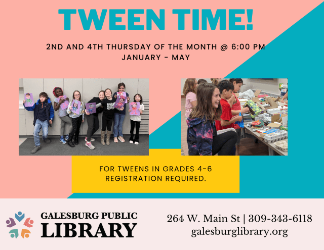 Galesburg Public Library 264 W Main St, GalesburgCalling all tweens in grades 4-6! Join us twice a month for fun crafts, games, or building challenges. We will focus on a different topic or activity each session. Advance registration is required.