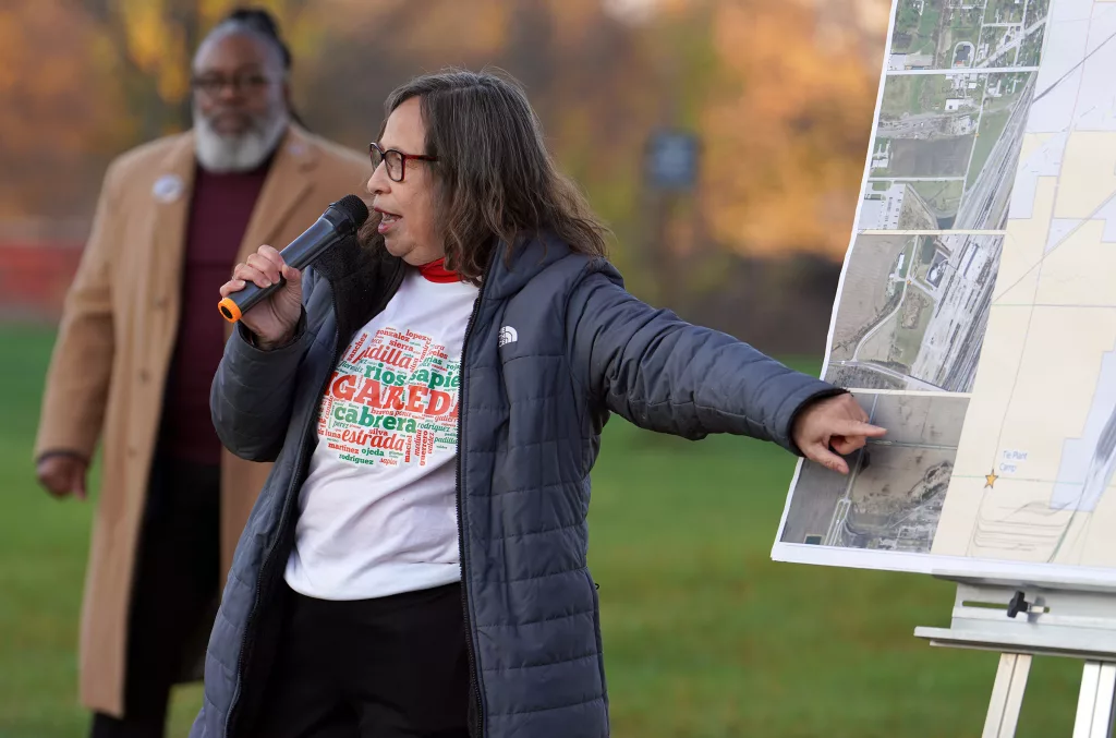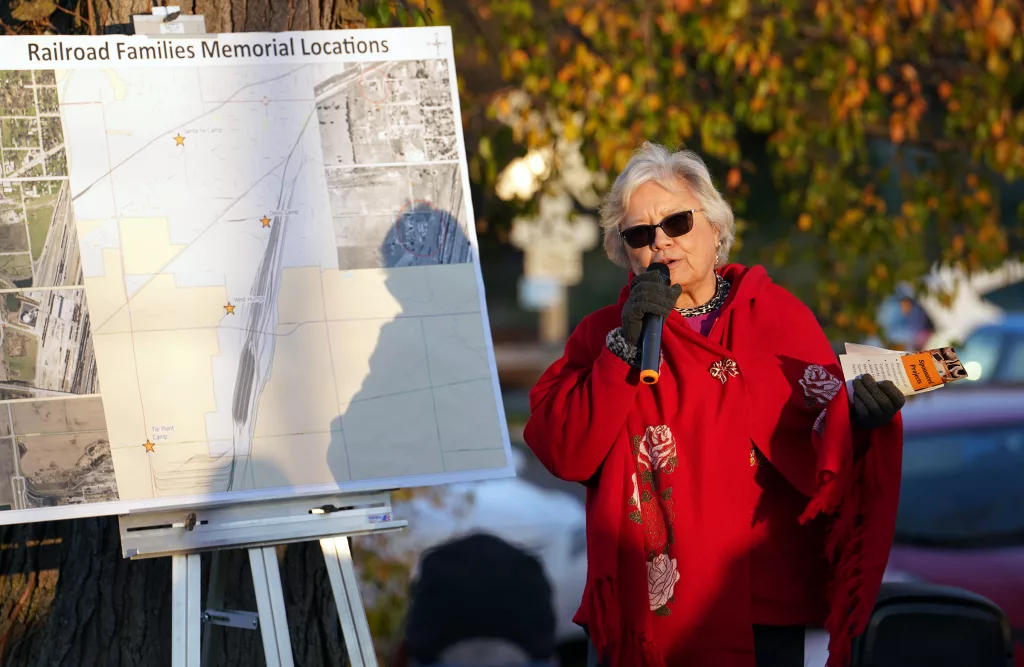 Irene Ponce addresses the crowd at a plaque dedication ceremony marking the location of four Railroad Camps on Monday, Oct. 30, 2023, in Galesburg. (BILL GAITHER/CARL SANDBURG COLLEGE)