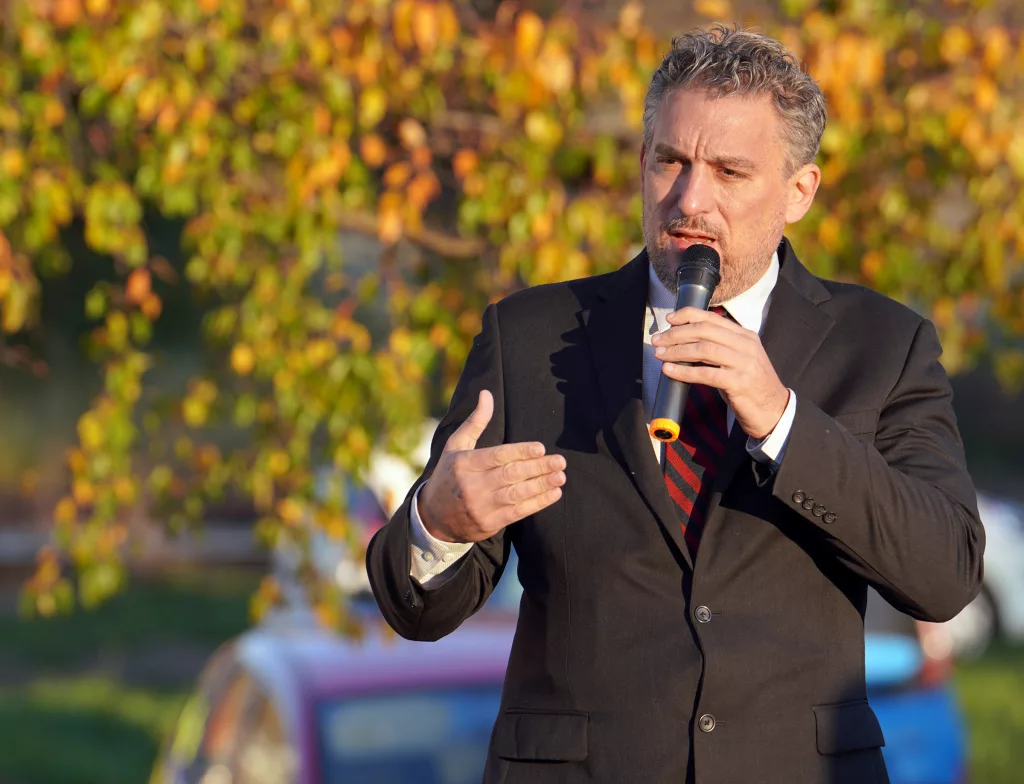 Galesburg Mayor Peter Schwartzman addresses the crowd at a plaque dedication ceremony marking the location of four Railroad Camps on Monday, Oct. 30, 2023, in Galesburg. (BILL GAITHER/CARL SANDBURG COLLEGE)