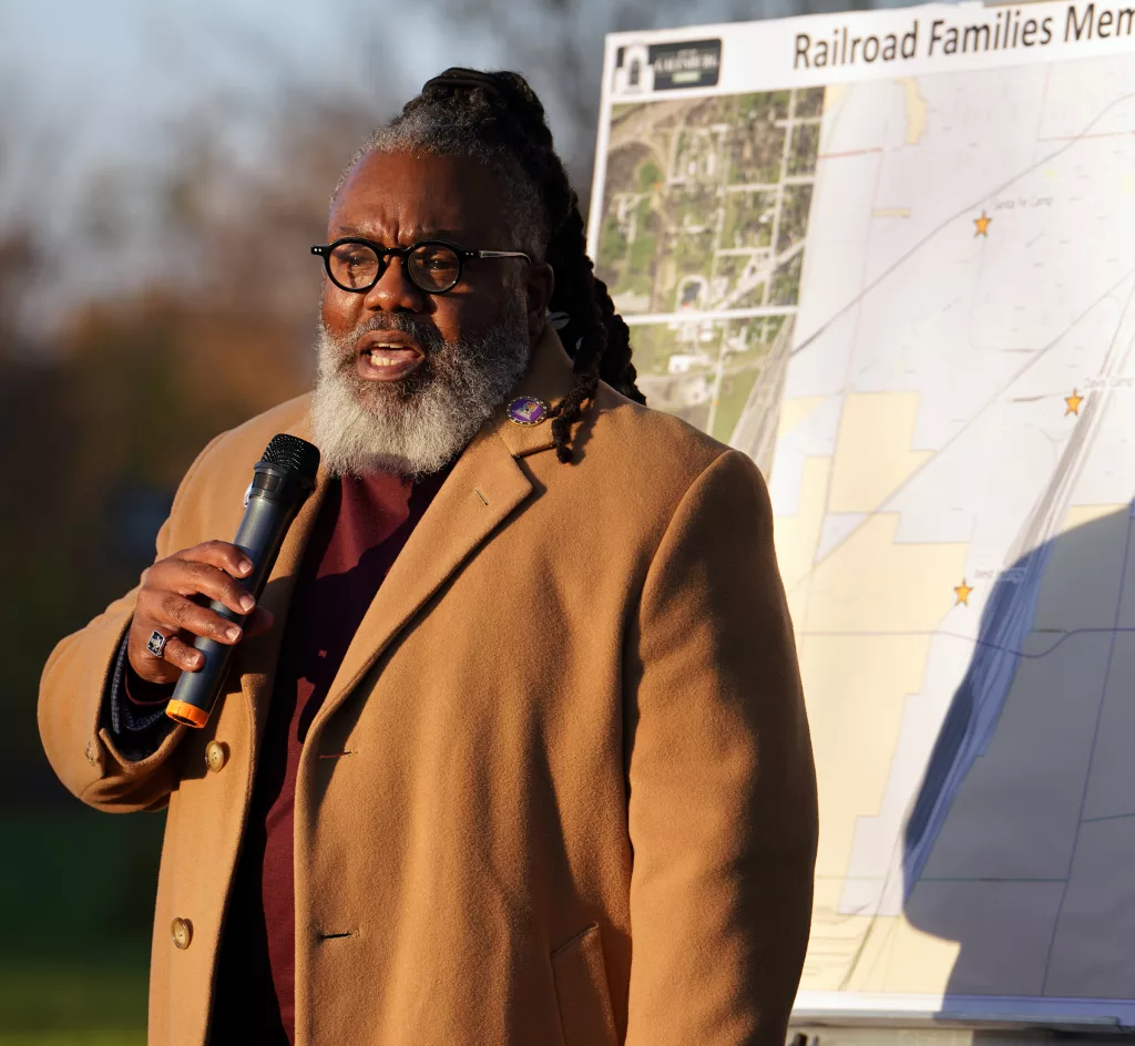 Carl Sandburg College Director of Diversity and Inclusion Anthony Law addresses the crowd at a plaque dedication ceremony marking the location of four Railroad Camps on Monday, Oct. 30, 2023, in Galesburg. (BILL GAITHER/CARL SANDBURG COLLEGE)