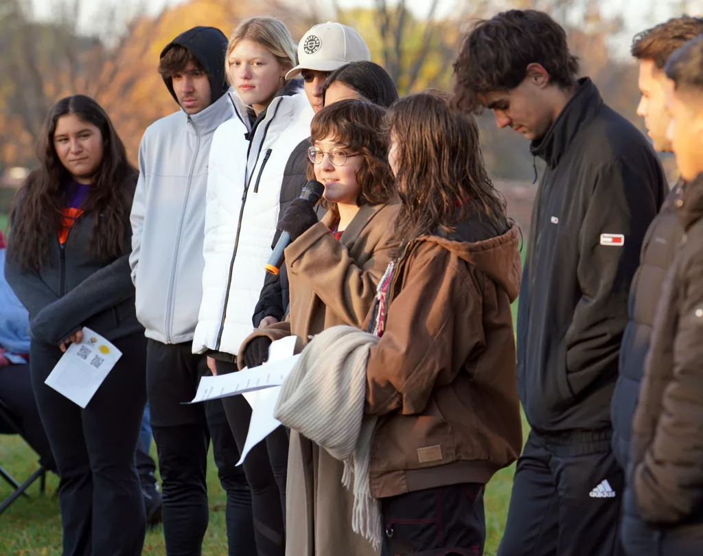 Nayana Foshay and Azaria Foshay and members of the Sandburg Hispanic-Latino Student Association address the crowd at a plaque dedication ceremony marking the location of four Railroad Camps on Monday, Oct. 30, 2023, in Galesburg. (BILL GAITHER/CARL SANDBURG COLLEGE)